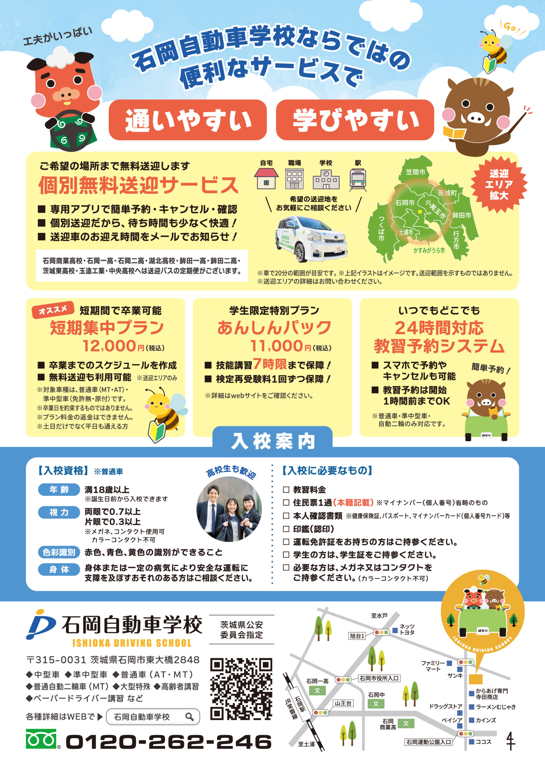 石岡自動車学校では、教習生のみなさまに安全に通学していただくために、自宅や学校・職場・駅などご希望場所まで無料で送迎を行っております。 無料送迎の予約もスマホで簡単にできるので、ラクラク通うことができます。