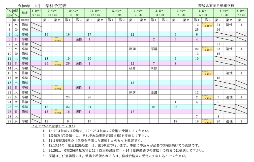 令和8年4月の学科予定表