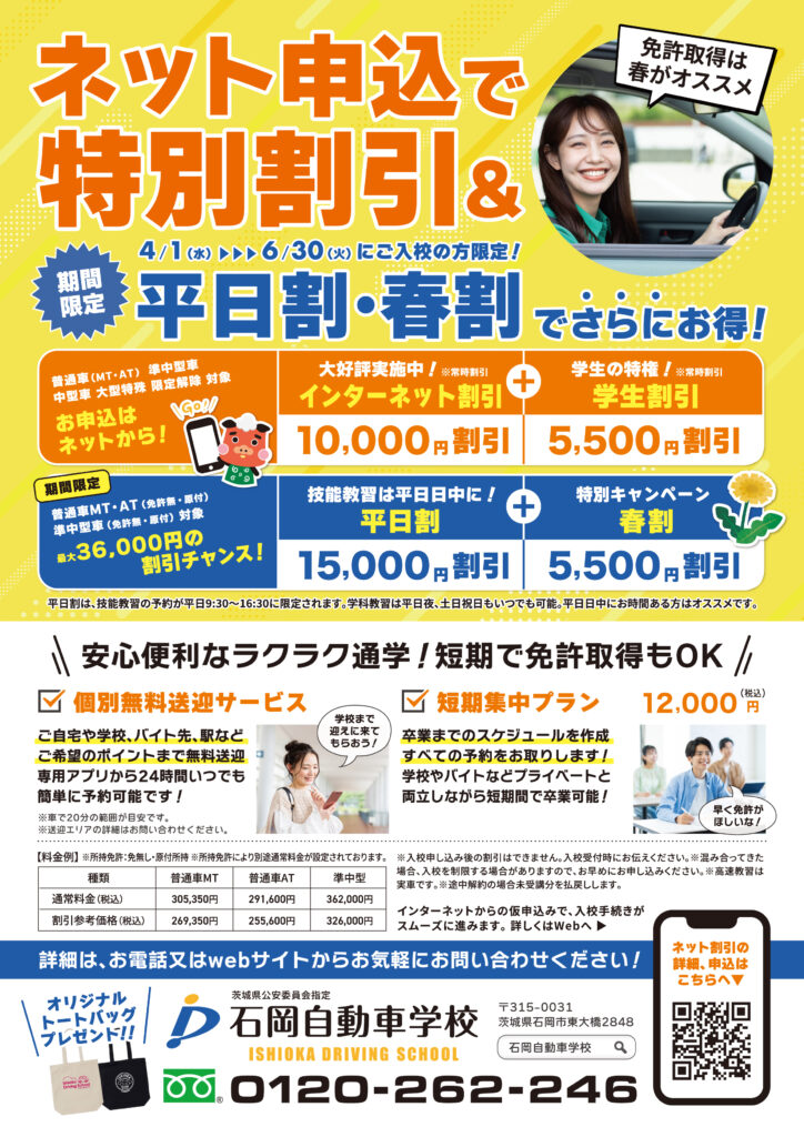 平日日中に技能教習受講が可能な方(学科教習はいつでもご受講いただけます)、教習基本料金から最大36,000円OFFとなるキャンペーンを実施します!